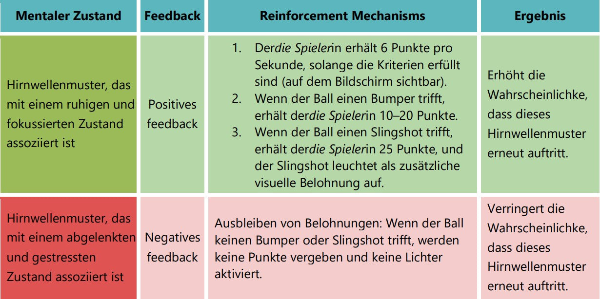 Die post-reinforcement Synchronization (PRS) bezeichnet eine kurze Pause nach der Verstärkung, in der sich die neuronale Aktivität stabilisieren und reorganisieren kann, was die Konsolidierung des Gelernten unterstützt. Das Pinball-Design fördert PRS durch vier wiederholte 5-minütige Runden sowie eine 30-sekündige, spielinterne „Relax Time“. Diese strukturierten Pausen reduzieren Ermüdung und ermöglichen es, dass sich das EEG-Muster vor der nächsten Runde zurücksetzen und stabilisieren kann. our product description here.